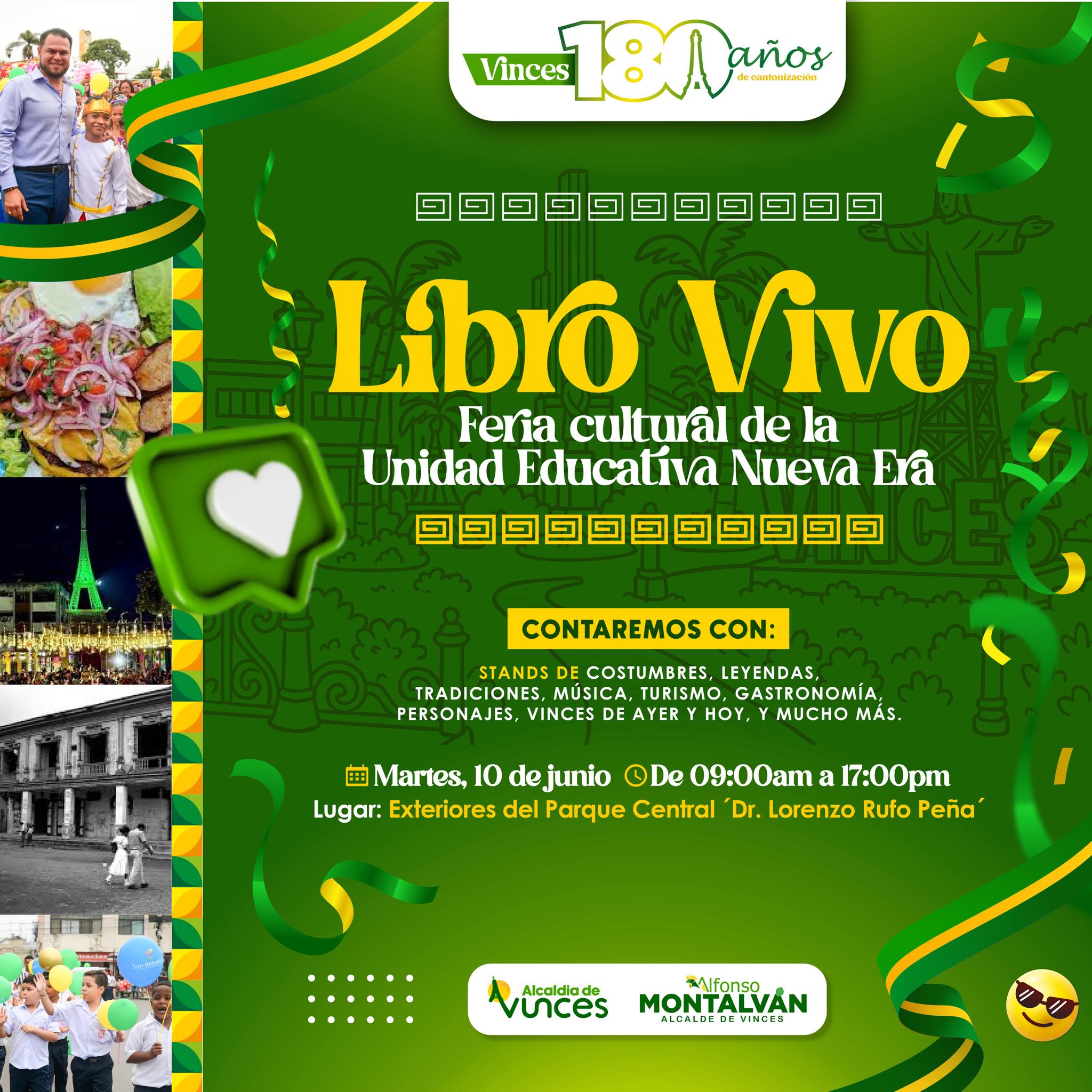 En el marco de los 180 años de cantonización de Vinces, te invitamos a ser parte de “Libro Vivo”, la feria cultural de la Unidad Educativa Nueva Era.