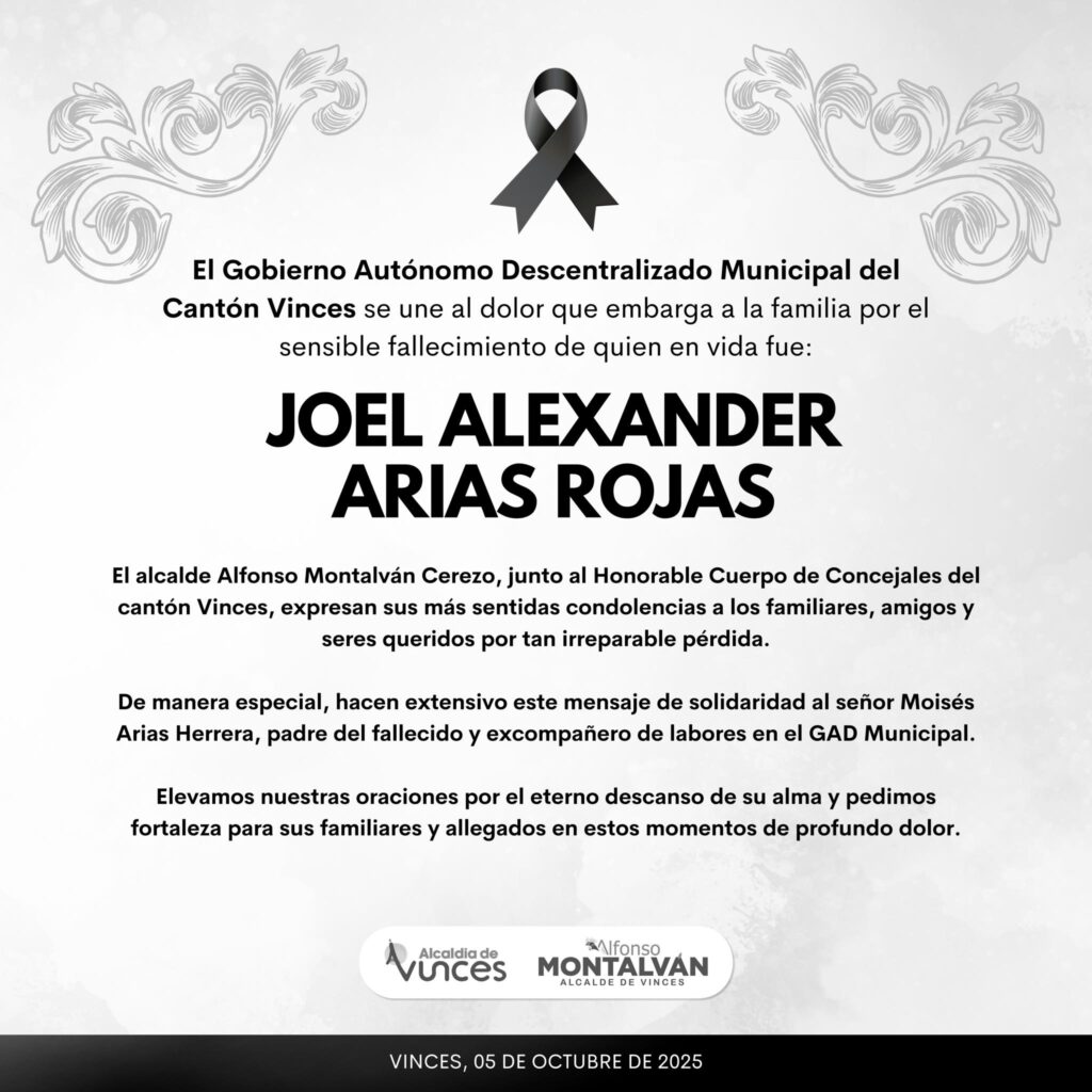 La Alcaldía de Vinces, en nombre del alcalde Alfonso Montalvan Cerezo, extiende un fraterno saludo al pueblo guayaquileño al conmemorarse 205 años
