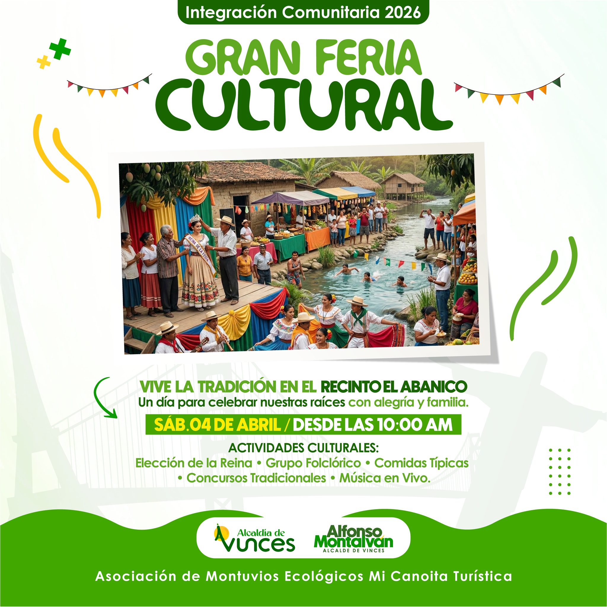 ¿Listos para vivir un día inolvidable en familia? La Alcaldía de Vinces, liderada por nuestro alcalde Alfonso Montalvan Cerezo, te invita a la «Integración Comunitaria 2026: Gran Feria Cultural». Ven a celebrar nuestras raíces, nuestra