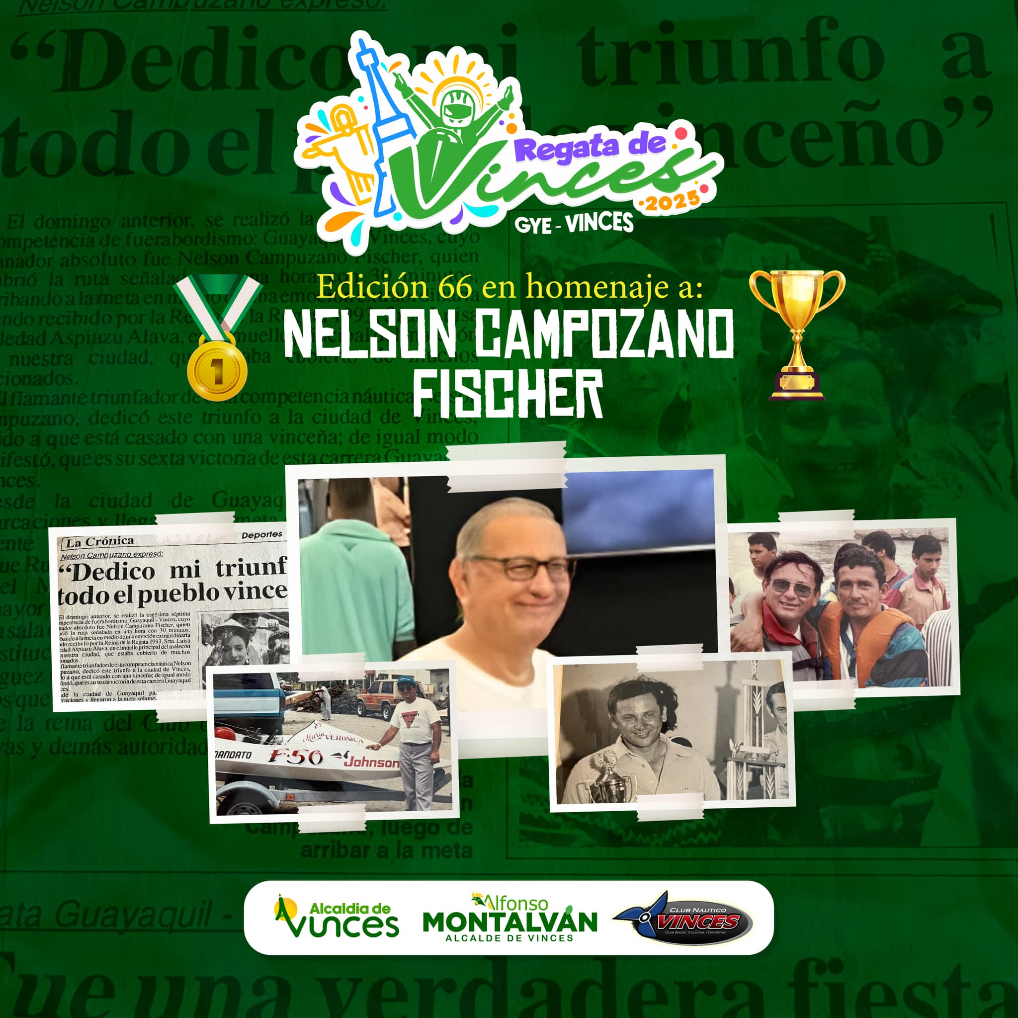 Nelson Campozano Fischer es sinรณnimo de fuerabordismo en Vinces. ๐‚๐ฎ๐š๐ญ๐ซ๐จ ๐ฏ๐ž๐œ๐ž๐ฌ ๐œ๐š๐ฆ๐ฉ๐ž๐จฬ๐ง ๐๐ž ๐ฅ๐š ๐ซ๐ž๐ ๐š๐ญ๐š ๐†๐ฎ๐š๐ฒ๐š๐ช๐ฎ๐ข๐ฅโ€“๐•๐ข๐ง๐œ๐ž๐ฌ ๐ฒ ๐œ๐จ๐ง ๐ฎ๐ง ๐ญ๐จ๐ญ๐š๐ฅ ๐๐ž ๐จ๐œ๐ก๐จ ๐ญ๐ขฬ๐ญ๐ฎ๐ฅ๐จ๐ฌ ๐ž๐ง ๐ฅ๐š ๐œ๐š๐ญ๐ž๐ ๐จ๐ซ๐ขฬ๐š ๐‘๐š๐œ๐ข๐ง๐ , su legado en esta histรณrica competencia es innegable. Para รฉl, la regata era mรกs que una carrera; era un desafรญo sin igual, รบnico en el mundo, que ponรญa a prueba la destreza y valentรญa de los pilotos.