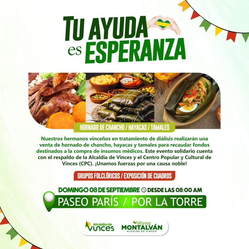 ¡Este domingo 8 de septiembre únete a una noble causa en Paseo París desde las 08:00 a.m.! Participa en la venta de hornado, hayacas y tamales para apoyar a nuestros hermanos vinceños en tratamiento de diálisis. Todos los fondos recaudados se destinarán a la compra de insumos médicos. Grupos folclóricos y una increíble exposición de arte te esperan. ¡Es una oportunidad para disfrutar, ayudar y hacer la diferencia! #VincesSolidario #TuAyudaEsEsperanza #UnidosPorUnaCausa