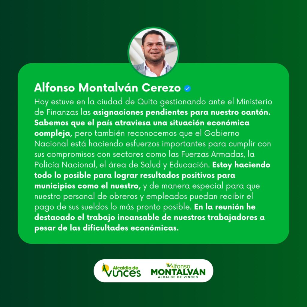 El alcalde Alfonso Montalvan Cerezo estuvo en Quito, gestionando ante el Ministerio de Finanzas las asignaciones pendientes para nuestro cantón.