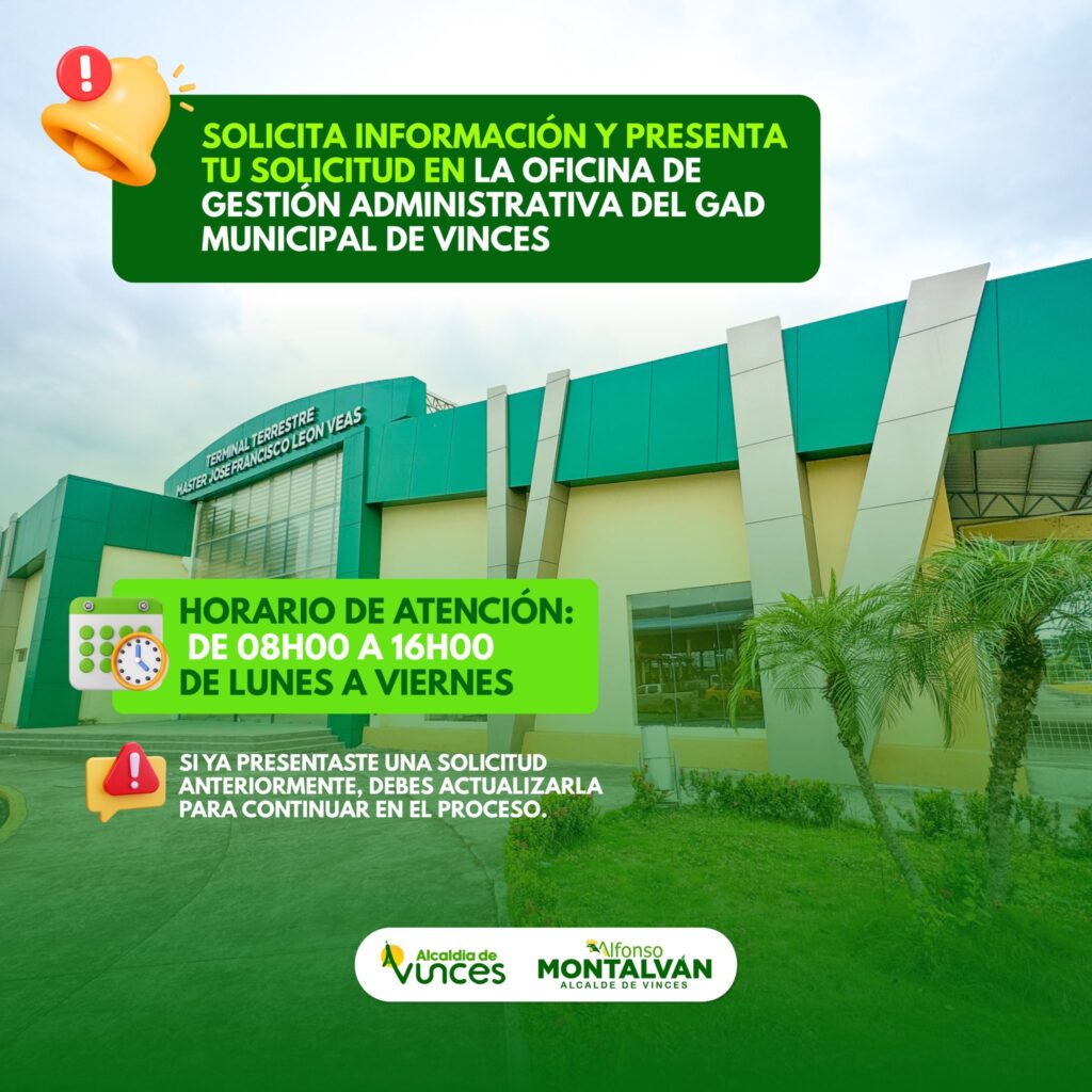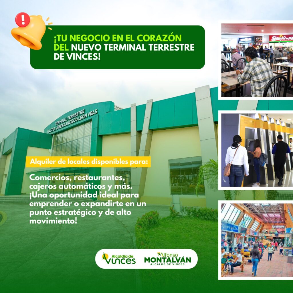 El Nuevo Terminal Terrestre de Vinces “Msc. Francisco León Veas” abre la convocatoria para el alquiler de locales comerciales, ideales para la instalación de restaurantes, tiendas, cajeros automáticos y otros servicios que contribuyan al desarrollo y comodidad de los usuarios de la terminal.