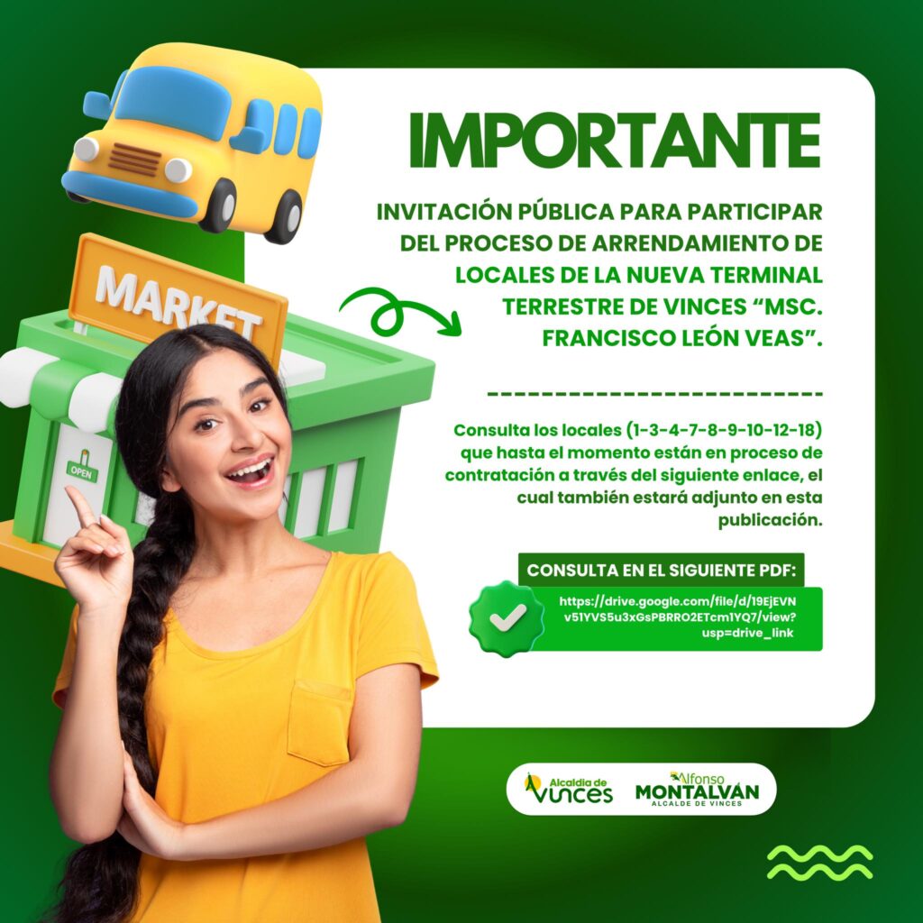 La Alcaldía de Vinces informa sobre el proceso de arrendamiento de locales comerciales en la nueva Terminal Terrestre “Msc. Francisco León Veas”.