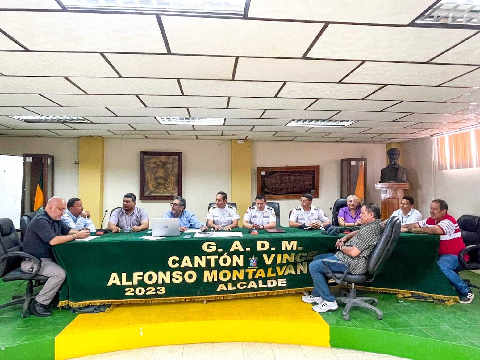 Posteriormente, se desarrolló una reunión de trabajo que contó con la participación de oficiales de la CTE en Vinces, así como delegados municipales en representación del burgomaestre: Jaime Zavala (director de Gestión Ambiental), Malves León (director de Ordenamiento Territorial), Fabricio Mendoza (jefe de Tránsito), Boris Elizalde (jefe del Terminal Terrestre), Julio Morán Díaz (comisario municipal), y autoridades políticas como la jefa política del cantón y el teniente político de la parroquia Antonio Sotomayor.