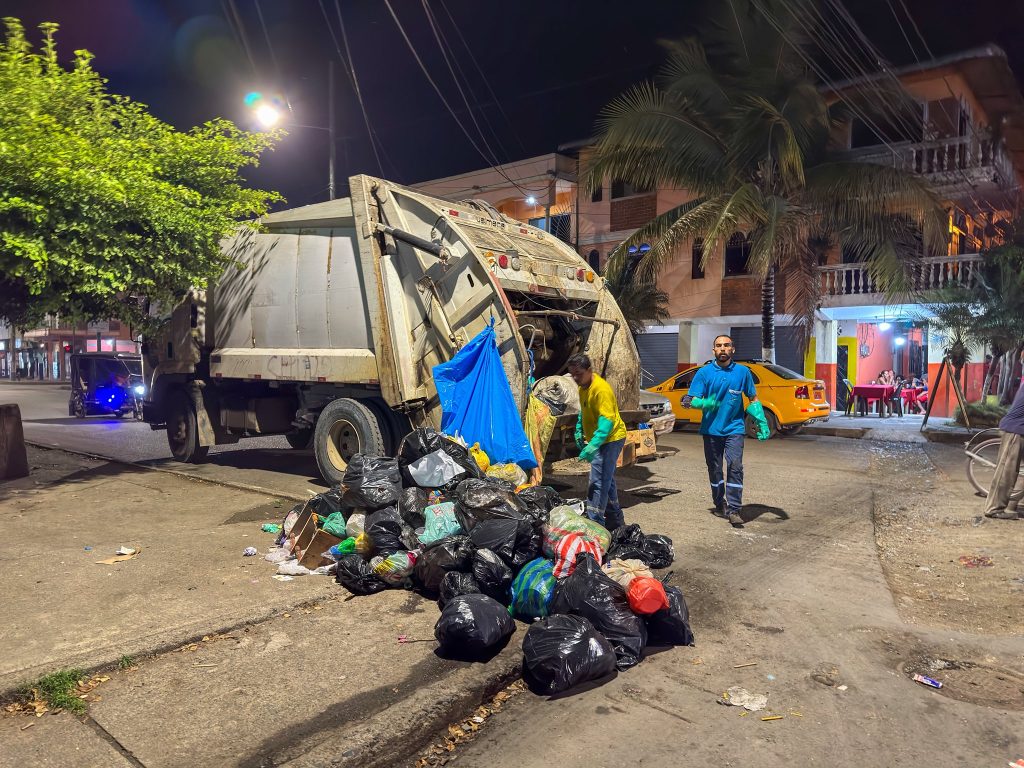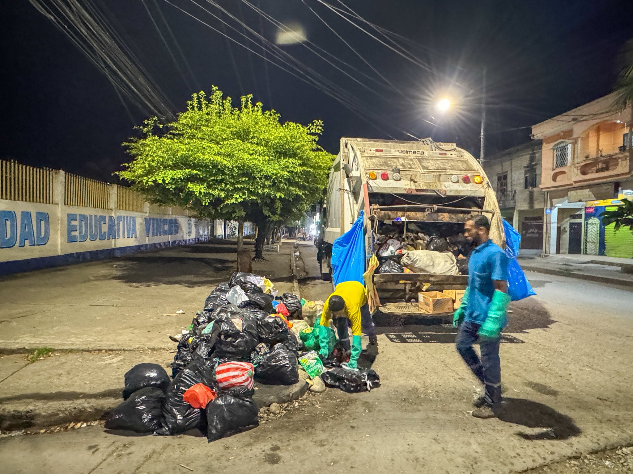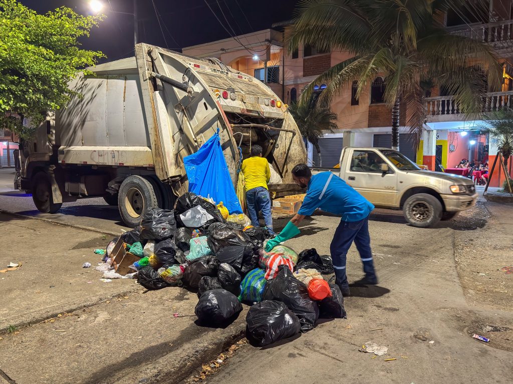Junto a nuestro personal de obreros municipales cumplimos jornadas nocturnas de recolección de basura en las principales calles de nuestra ciudad, trabajando para mantener un cantón más limpio y ordenado.