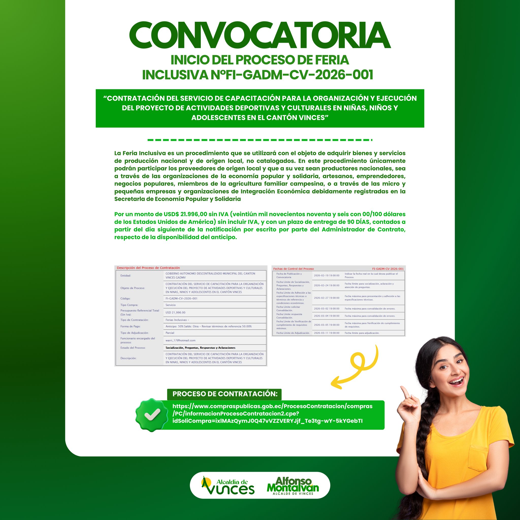 La Alcaldía de Vinces inicia el proceso de #FeriaInclusiva FI-GADM-CV-2026-001 para la contratación del servicio de capacitación para la organización y ejecución del proyecto de actividades deportivas y culturales en niñas, niños y adolescentes.