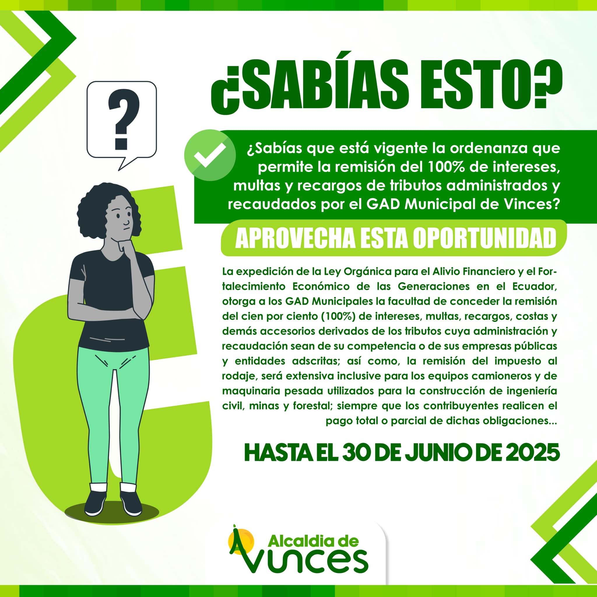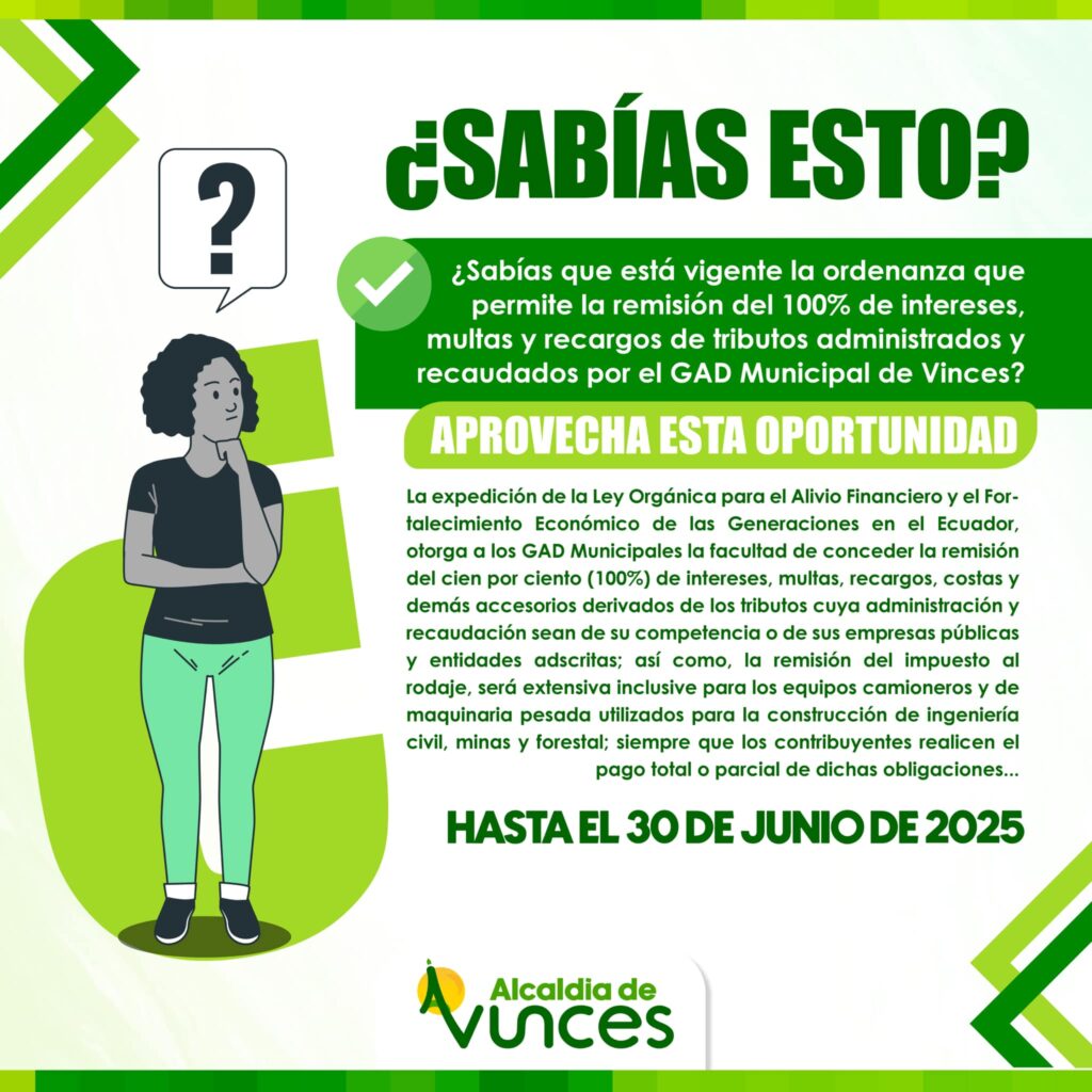Sabías que, está en vigencia la Ley Orgánica para el Alivio Financiero y el Fortalecimiento Económico de las Generaciones en el Ecuador, que permite al GAD Municipal de Vinces conceder la remisión del 100% de intereses, multas, recargos y costos derivados de tributos municipales, así como del impuesto al rodaje.