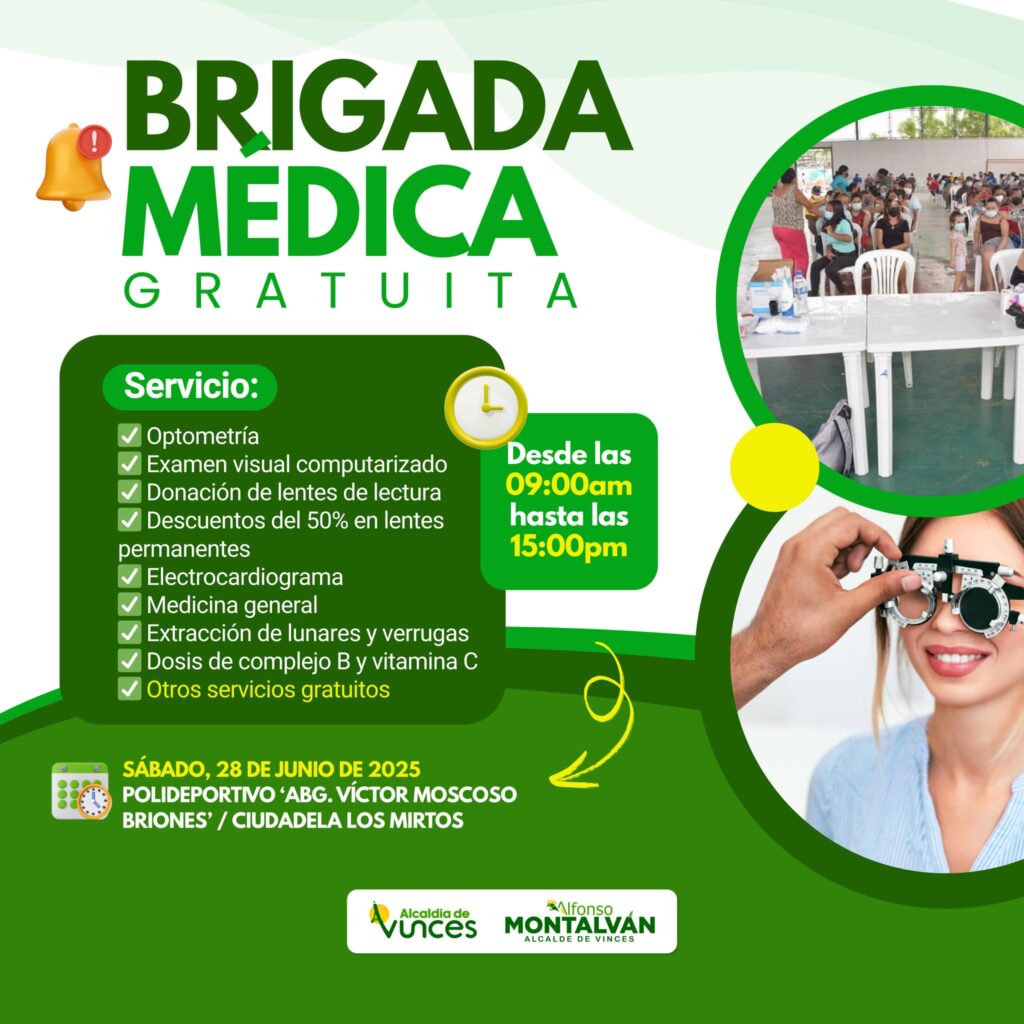 La Alcaldía de Vinces y el alcalde Alfonso Montalvan Cerezo invita a toda la ciudadanía a participar en la Brigada Médica Gratuita que se realizará el sábado 28 de junio de 2025, desde las 09:00 hasta las 15:00, en el Polideportivo “Abg. Víctor Moscoso Briones”, ubicado en la Ciudadela Los Mirtos.