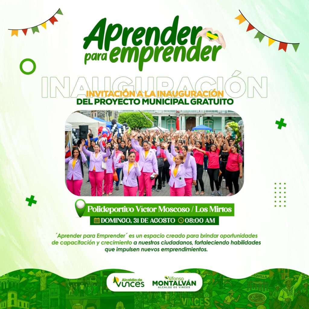 La Alcaldía de Vinces, liderada por el alcalde Alfonso Montalvan Cerezo, te invita a la inauguración del proyecto municipal gratuito “Aprender para Emprender”, un espacio diseñado para abrir nuevas oportunidades de crecimiento y emprendimiento.