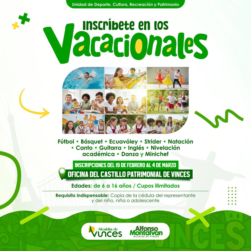 La Alcaldía de Vinces y el alcalde Alfonso Montalvan Cerezo te invitan a inscribir a tus hijos en los #Vacacionales2026, un espacio pensado para potenciar