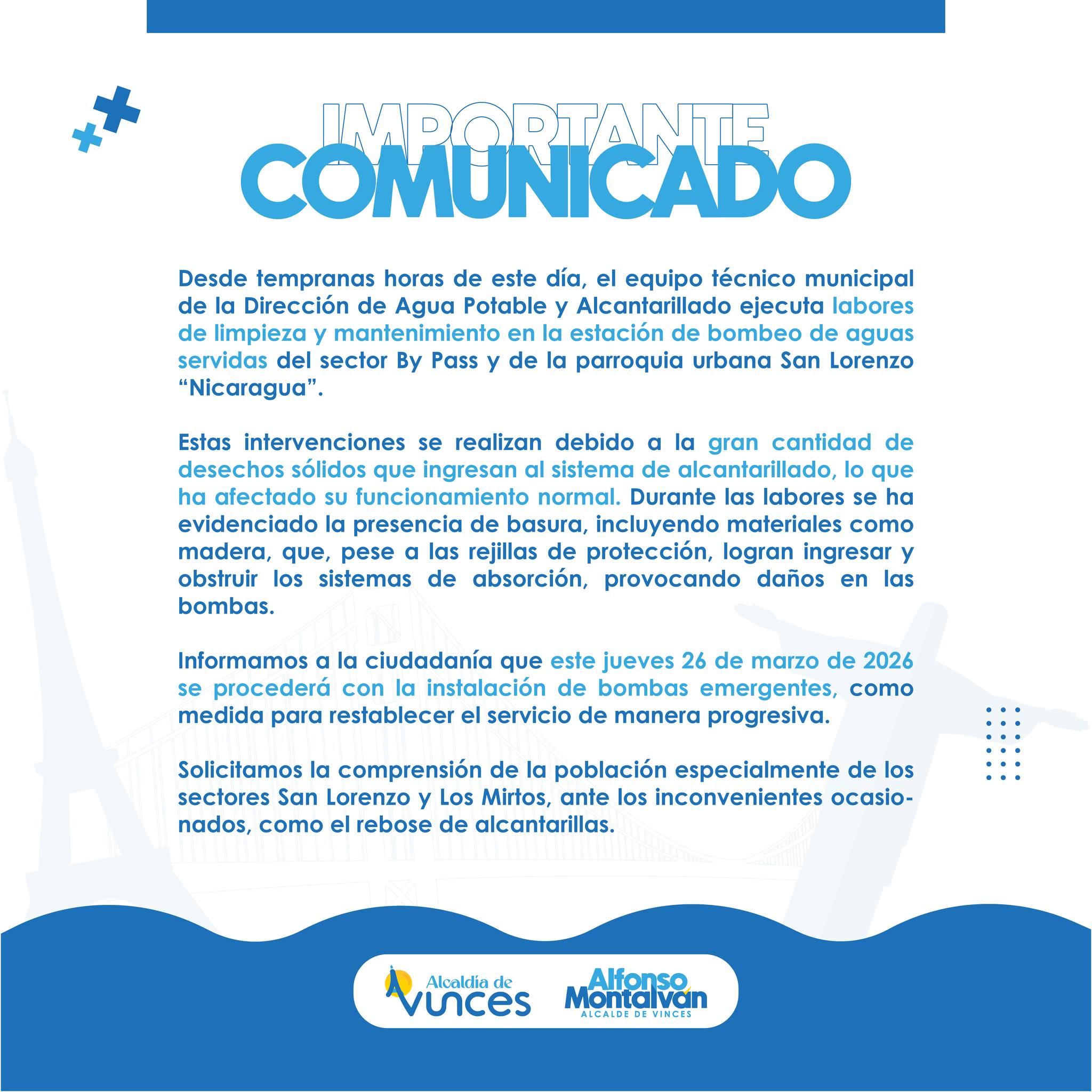 Solicitamos la comprensión de la ciudadanía, especialmente de los sectores San Lorenzo y Los Mirtos, ante los inconvenientes ocasionados como el rebose de alcantarillas, debido a la acumulación de desechos sólidos que ha afectado el normal funcionamiento del sistema. Informamos que este jueves 26 de marzo de 2026 se realizará la instalación de bombas emergentes para restablecer el servicio.