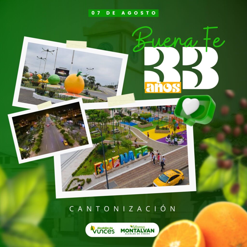 Desde la Alcaldía de Vinces, liderada por el alcalde Alfonso Montalvan Cerezo, extendemos un fraterno saludo al cantón Buena Fe al conmemorar un nuevo aniversario de cantonización.