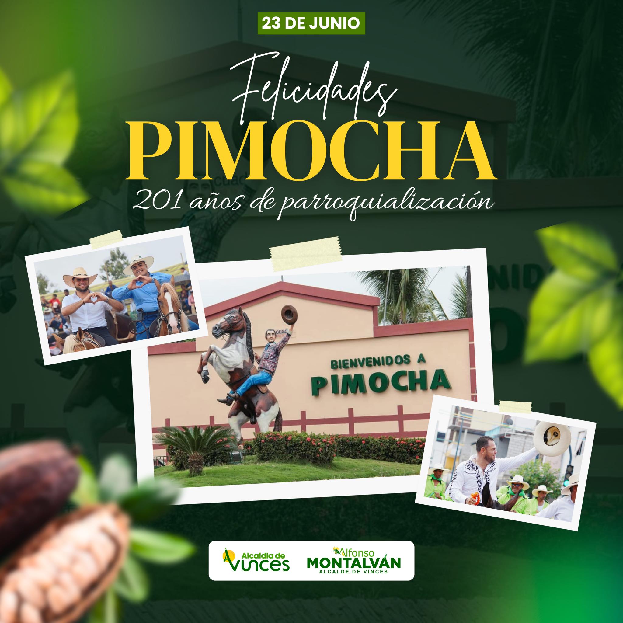 En nombre del cantón Vinces y de su alcalde, Alfonso Montalvan Cerezo, extendemos un fraternal saludo a su gente trabajadora y orgullosa de sus raíces ¡Felicidades, Pimocha!