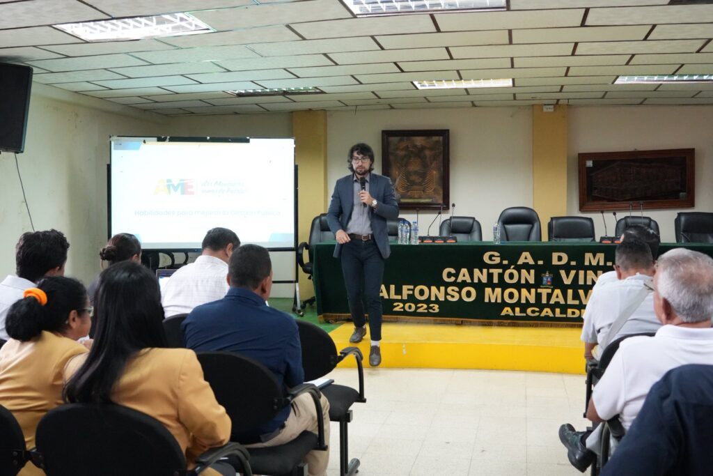 Gracias a la gestión del alcalde Alfonso Montalvan Cerezo, presidente de la AME Regional 5, hoy en la sala de sesiones del GADM de Vinces se desarrolló la capacitación “Habilidades para mejorar la Gestión Pública”, dictada por el Magíster Javier Guarnizo Ponce, Coordinador de Capacitación de la AME: Asociación de Municipalidades Ecuatorianas.