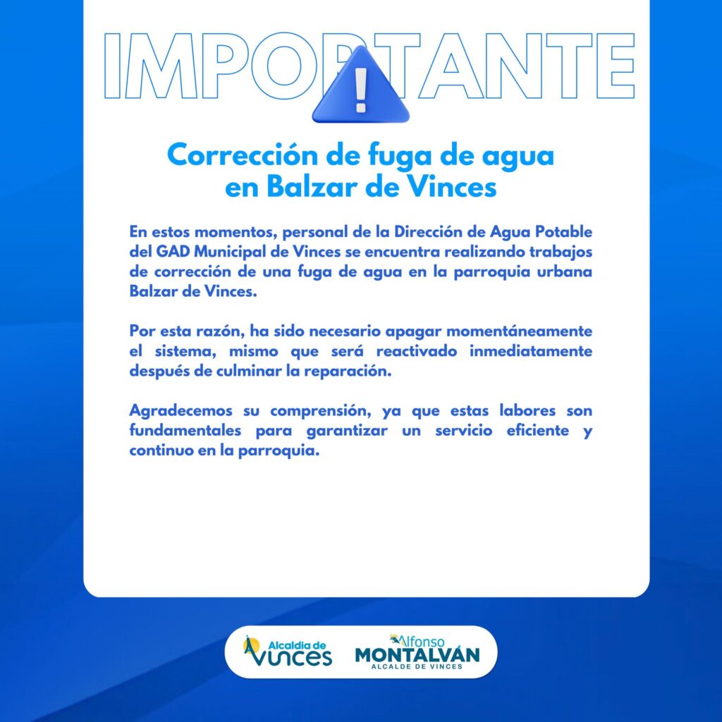En estos momentos, personal de la Dirección de Agua Potable del GAD Municipal de Vinces se encuentra realizando trabajos de corrección de una fuga de agua en la parroquia urbana Balzar de Vinces.